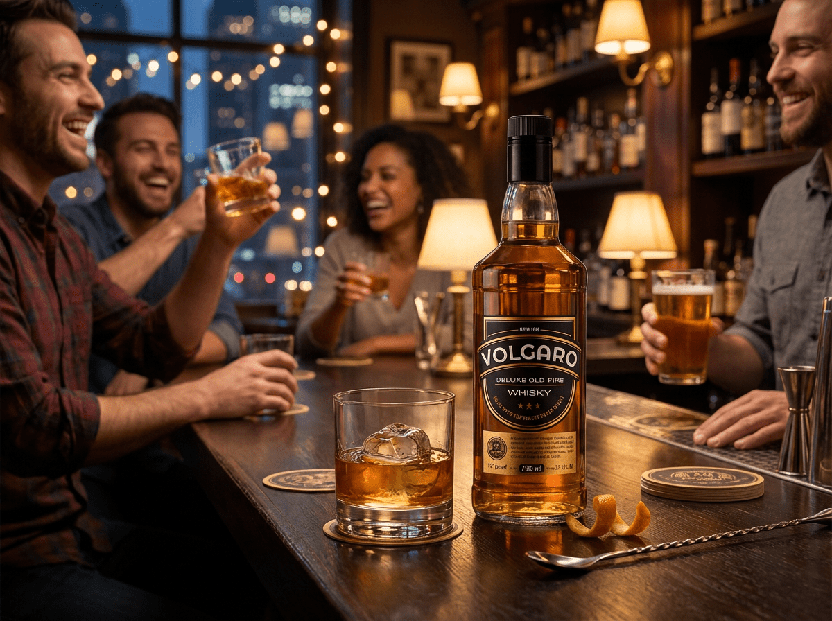 VOLGARO deluxe old fine whisky is a premium blend crafted from a selection of imported Scotch malts and high-quality Indian grain spirits. This combination creates a smooth and well-balanced whisky, offering rich flavors of oak, caramel, and subtle smokiness. Perfect for those who appreciate a refined and sophisticated drinking experience.